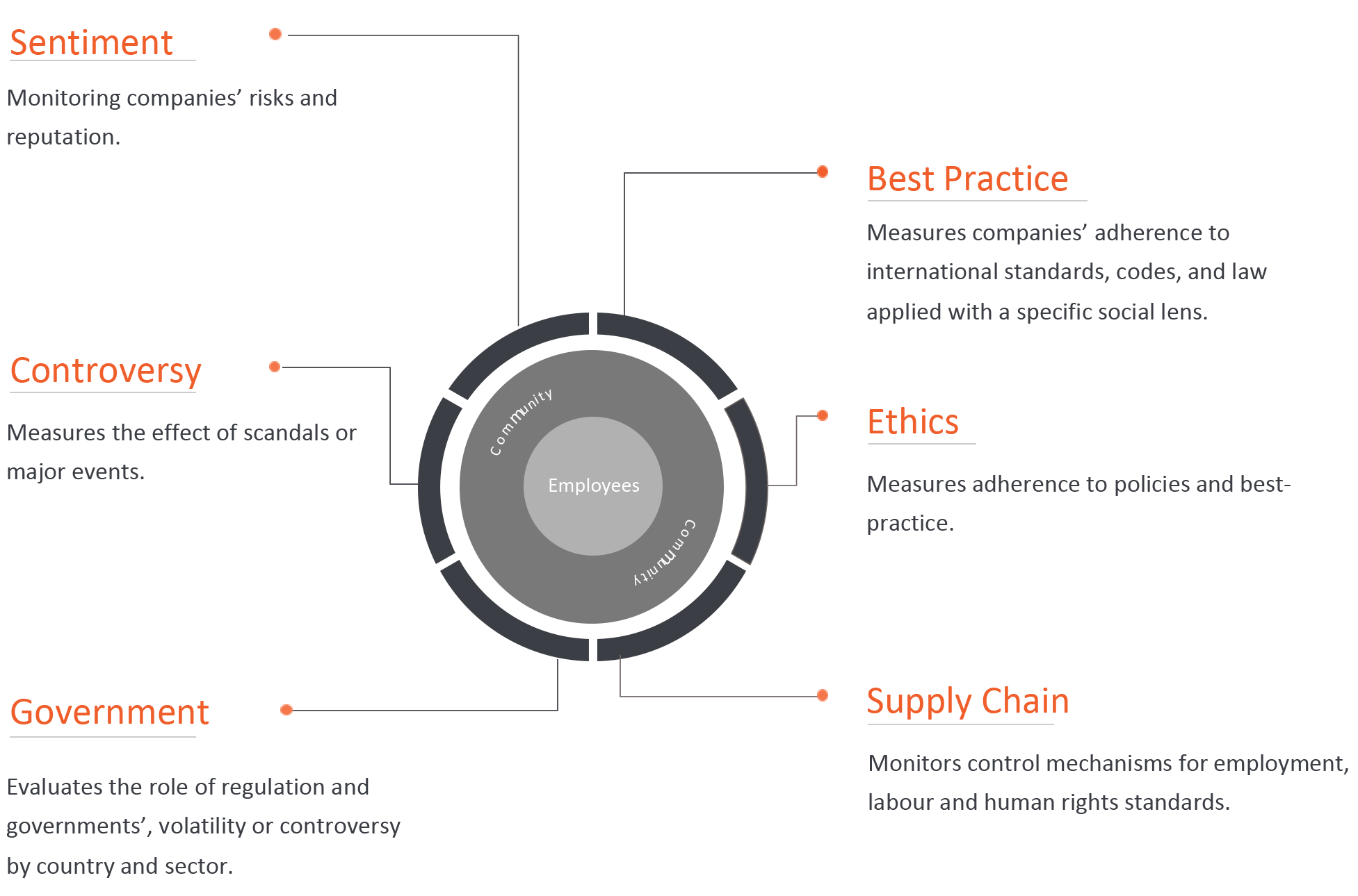 Highlights from our comprehensive taxonomy screen for the largest number of social criteria across the entire ESG market - structured by 6 categories consisting of 74 social impact themes, hundreds of indicators, and thousands of metrics. Our performance data provides deep-analytics in relation to hundreds of possible queries.